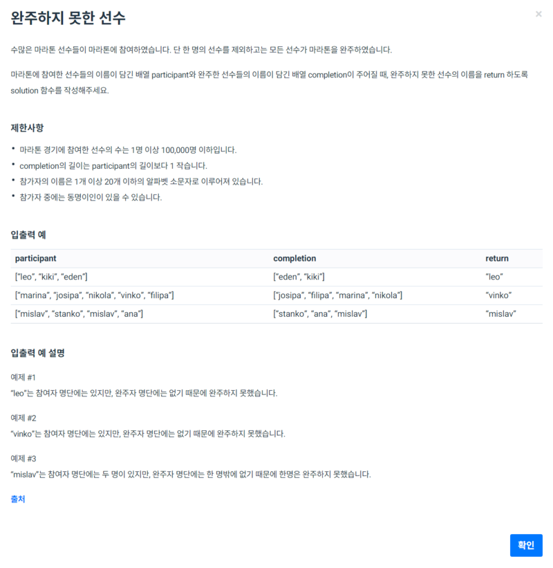 - 예외처리 : 미완주자가 participant의 맨마지막에 위치할 경우, for문안에서 해결되지않으므로 별도로 마지막 값 리턴