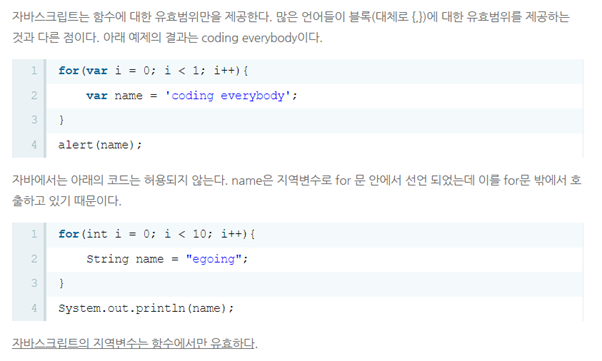 block-level scope : let, const (ES6=ECMAScript2015에서 추가됨)