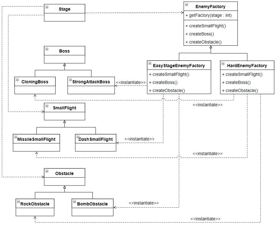 이들을 사용해 객체를 생성하는 코드는 EnemyFactory의 하위인 EasyStageEnemyFactory, HardEnemyFactory로 옮겨졌다.