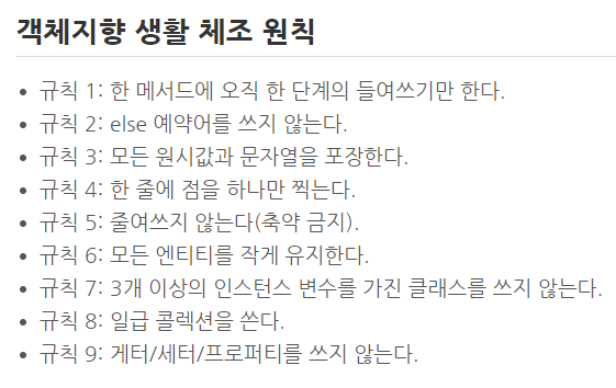 setter는 없이 코딩가능하다. getter는 최대한 자제하다 맨 뒷단의 DTO에서 view를 위해 꺼내쓰는것이 최선.