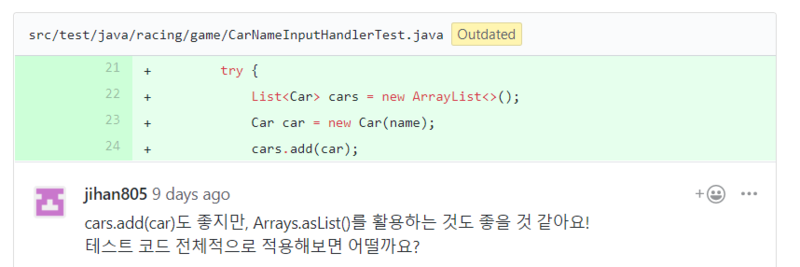 List<Car> cars = Arrays.asList(new Car("pobi"), new Car("sean")); 과 같은 형태로 사용 추천