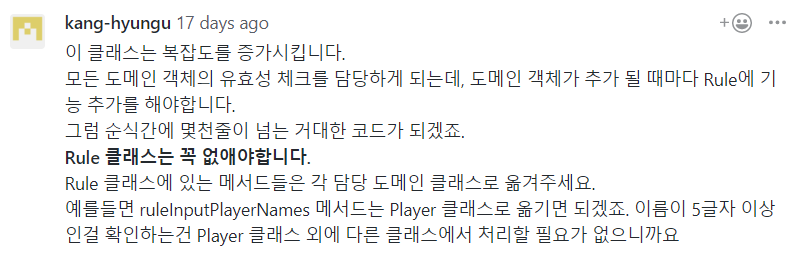 : 각 객체들의 유효성 체크를 모아둔 Rule로서의 클래스가 별로라는 피드백이었다.
