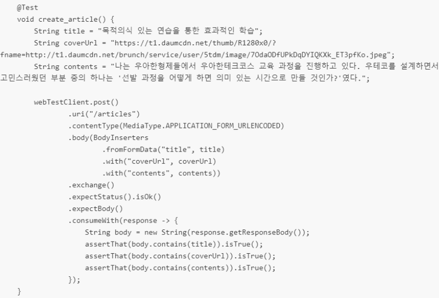 - 테스트 코드에서의 반복되는 부분들을 줄일 생각자체도 처음으로 하게 되었다. -> 이후 주차엔 중복이 더 많아져 `AbstractControllerTest.class`처럼 메소드 뿐아니라 클래스로 빼기도 함.