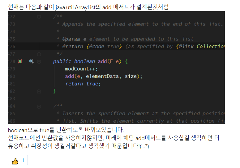 - 이제까진 반환값이 필요없고 사용하지 않으면 무조건 void로 리턴했었는데, 아직은 안써도 설계상의 이유로 원하는 타입을 리턴시키는 관점도 생각해보게됨. -> 이후의 주차에서 Entity 메소드를 설계할때 참고하게 되었음