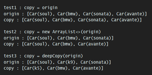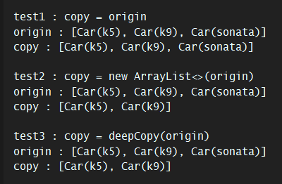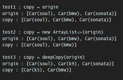 System.out.println("\ntest3 : copy = deepCopy(origin)");