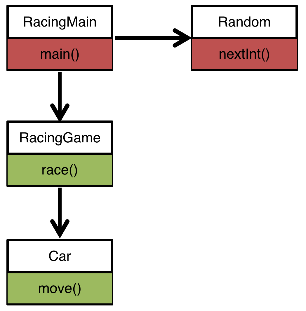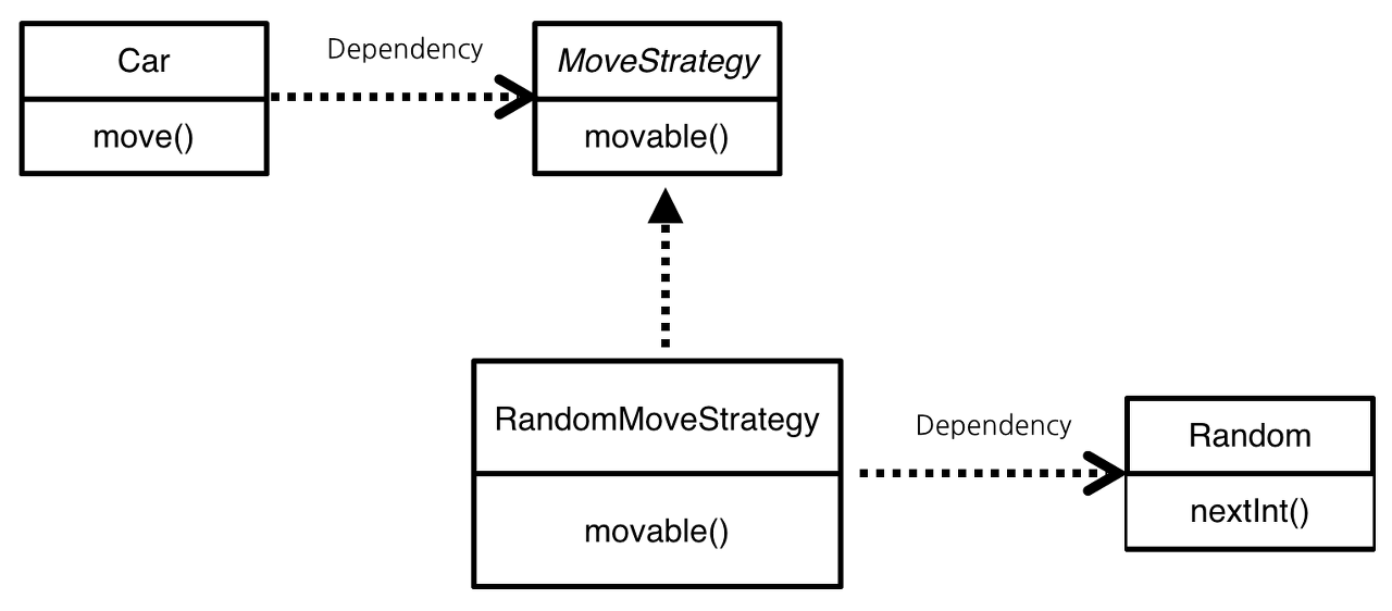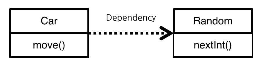 예를 들어 Car가 Random 객체를 사용해 기능을 구현한다면 Car는 Random에 의존관계를 가진다.