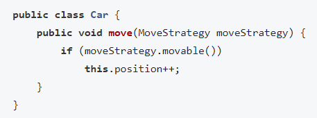 예를 들어 Car가 Random 객체의 의존관계를 없애기 위해 MoveStrategy를 추가했다면 이에 대한 의존관계를 외부에서 결정한다.
