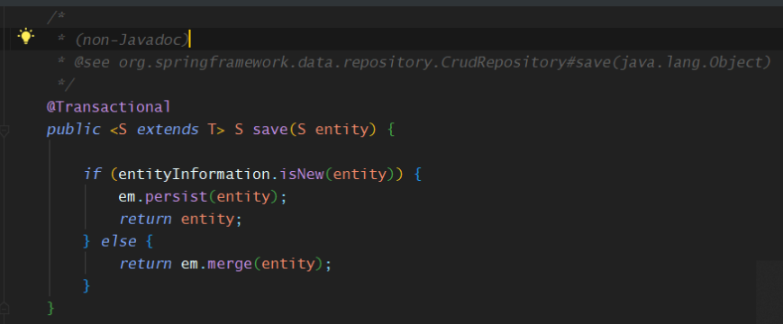 SimpleJpaRepository의 save가 이렇게 생겨있다. 한 트랙젝션 단위를 이루는데 이걸 호출하는 서비스 메소드에서 save를 여러번 하고 메소드에 @Transactional가 붙어있다면?