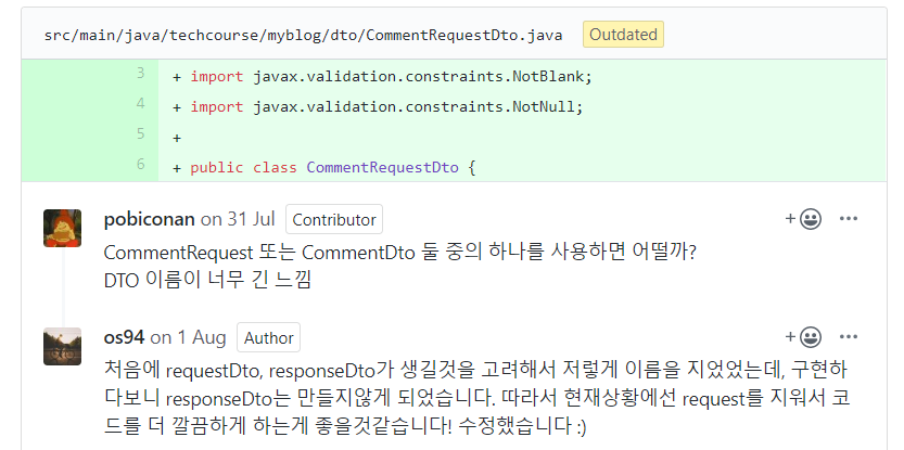 -Dto와 같이 간단히 쓰고 여러개라면-Request,-Response등과 같이 직접적으로 의미를 갖게하는것도 괜찮겠다고 스스로 정리했다.