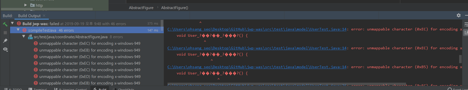 그러던 어느날, 이번엔 갑자기 build할때 한글이 깨지기 시작했다.