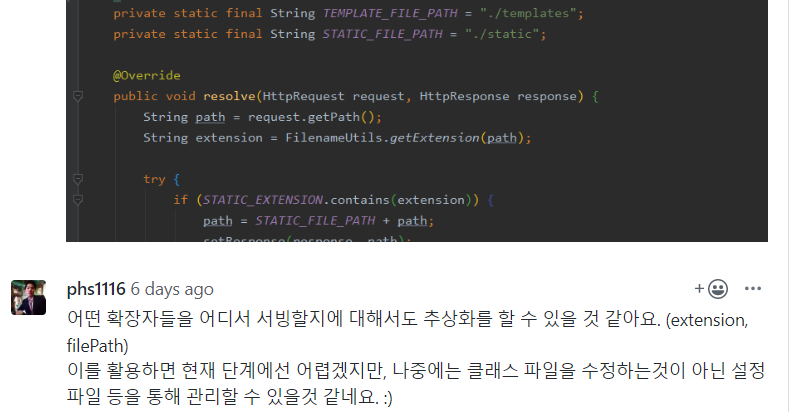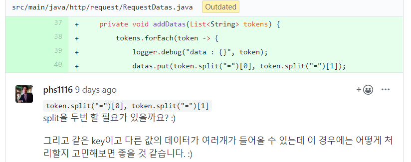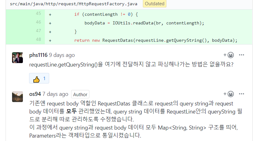 - 맨 처음에 깊숙히 있던 DataOutputStream을, 리팩토링하며 테스트하기 쉽게 최대한 끌어올렸다. 한편으로 이 피드백처럼 한단계정돈 가지고 들어가서 response가 컨트롤하는것도 괜찮을것같다.