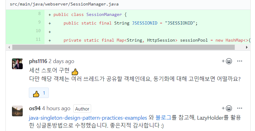- 보류된 이슈 / controller(MVC의 컨트롤러가 아닌, 현재 코드의)에선 최대한 비즈니스로직만 수행하고, 쿠키를 굽는 부분은 분리하는게 맞는것같긴하다. 다만 구현이 쉽지않아서 일단은 보류한 상태. 크루들과 얘기해보니, 나같은 경우는 맨처음 RequestHandler에서 Response를 만들때 생성자로 request를 참조하고있으므로, request.getSession()할때 request에 쿠키를 추가하고, 이를 response가 참조해 set-cookie하는 가능성도 있을것같다. 대신 request는 한번 들어오면 값이 바뀔것같진않은데, 이를 수정한다는게 조금 어색하다는 생각. 또는 request가 어떻게 들어오는지와 상관없이 response에서 무조건 쿠키를 설정한다는 크루도?