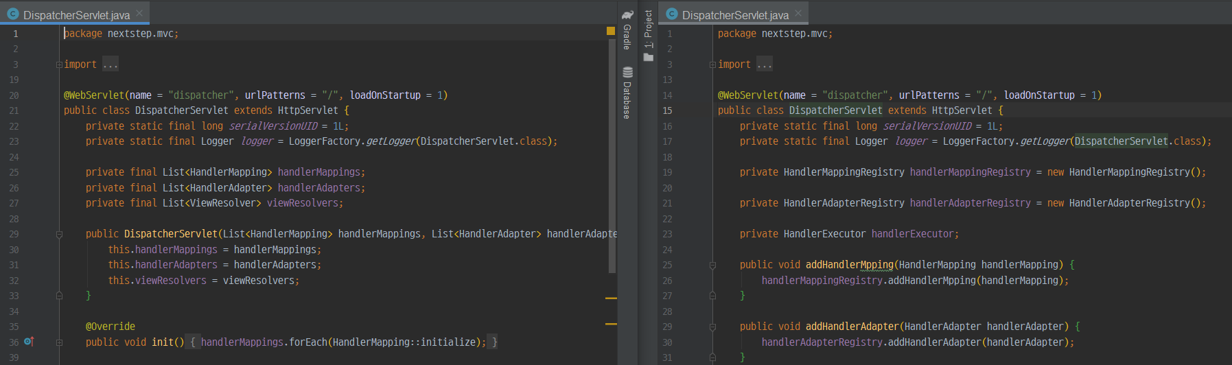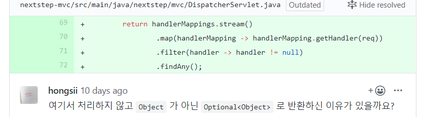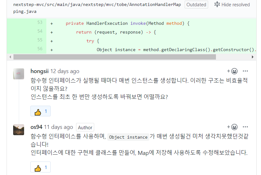 - 리팩토링 과정에서 ManualHandlerMapping에서 인터페이스 추출을 위해 getHandler 메소드의 타입을 약간 수정해야했던(새로운 리팩토링을 위해 기존 레거시 코드를 손대야했던) 찝찝함- 정답은 없다는 답변, 역시 상황에 맞게. 지금은 코드가 복잡하지않고 모든 코드를 컨트롤할수있어서 우리가 약간의 수정을 할 수 있었음.