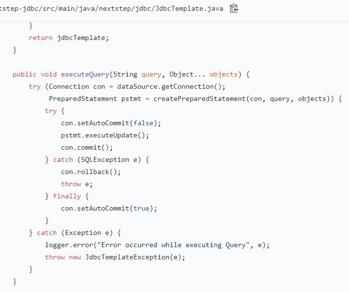 - 하지만 다시 생각해보니, select문같은건 롤백이 필요없을 뿐만 아니라, executeQuery, query, queryForObject 세 메소드 모두 pstmt.executeQuery() 작업이 한번만 일어난다.