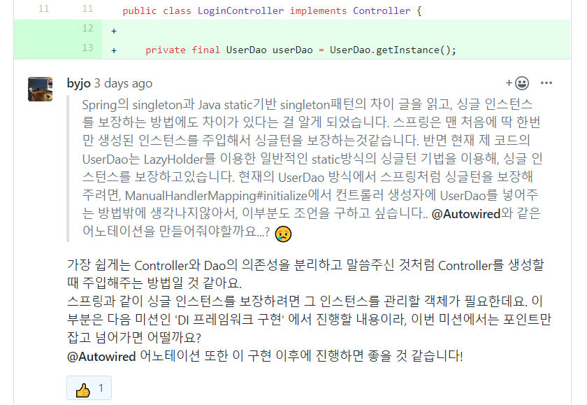 - 현재의 코드에서 스프링 방식으로 싱글 인스턴스를 보장하는 방법을 생각해봤더니, 컨트롤러를 생성할때 UserDao를 하나 만들어서 이를 주입해주는 방법이 떠올랐다. (ManualHandlerMapping#initialize) 또는 `@Autowired` 어노테이션을 만드는 방법도 있을것같았다.