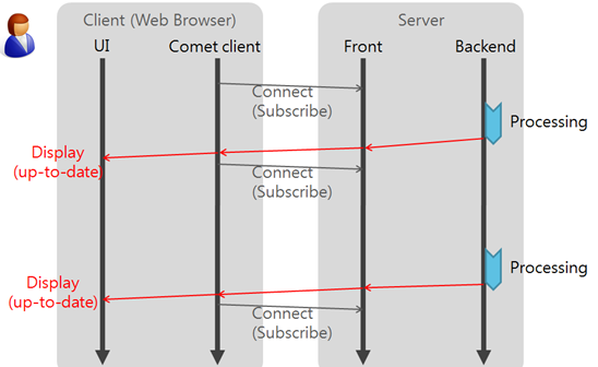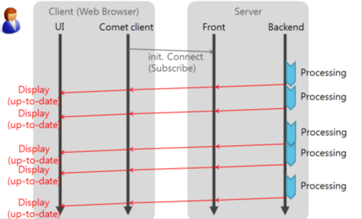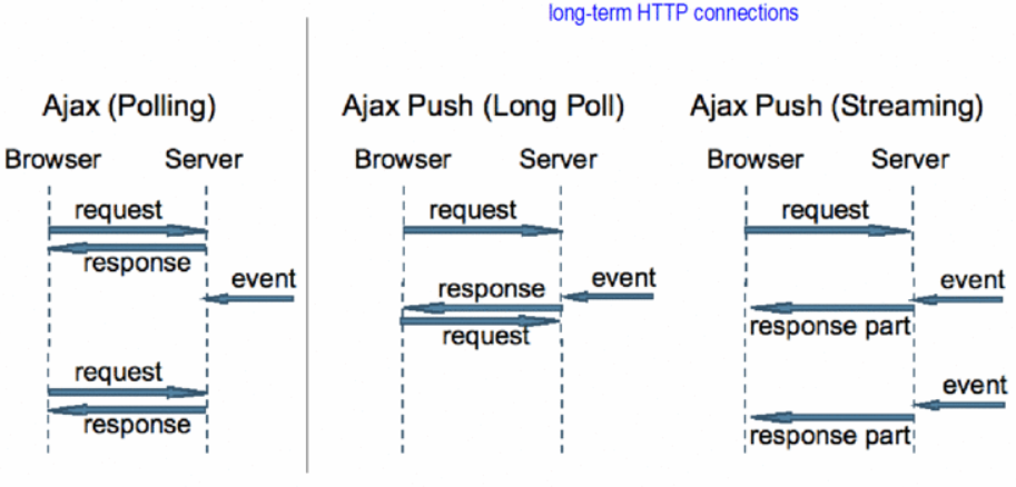 - HTTP 프로토콜 특성상 웹페이지에서 연결이 유지되지 않는다(단방향). 따라서 서버가 클라이언트에게 통지(Server Push)할 방법이 없고, 비슷한 효과를 낼 수 있는 Polling, Long Polling, Streaming 방식이 등장