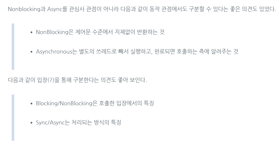 - "Blocking-Async는 별다른 장점이 없어서 일부러 사용할 필요는 없지만, NonBlocking-Async 방식을 쓰는데 그 과정 중에 하나라도 Blocking으로 동작하는 놈이 포함되어 있다면 의도하지 않게 Blocking-Async로 동작할 수 있다."