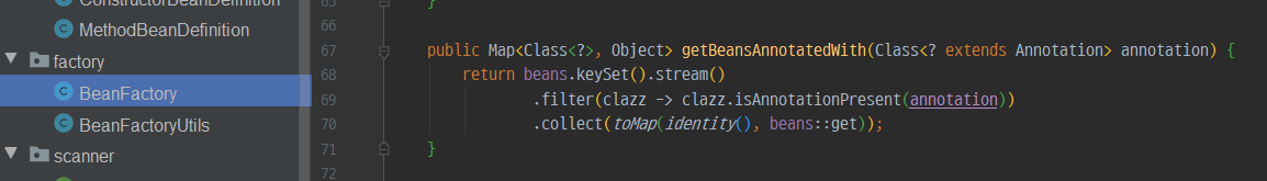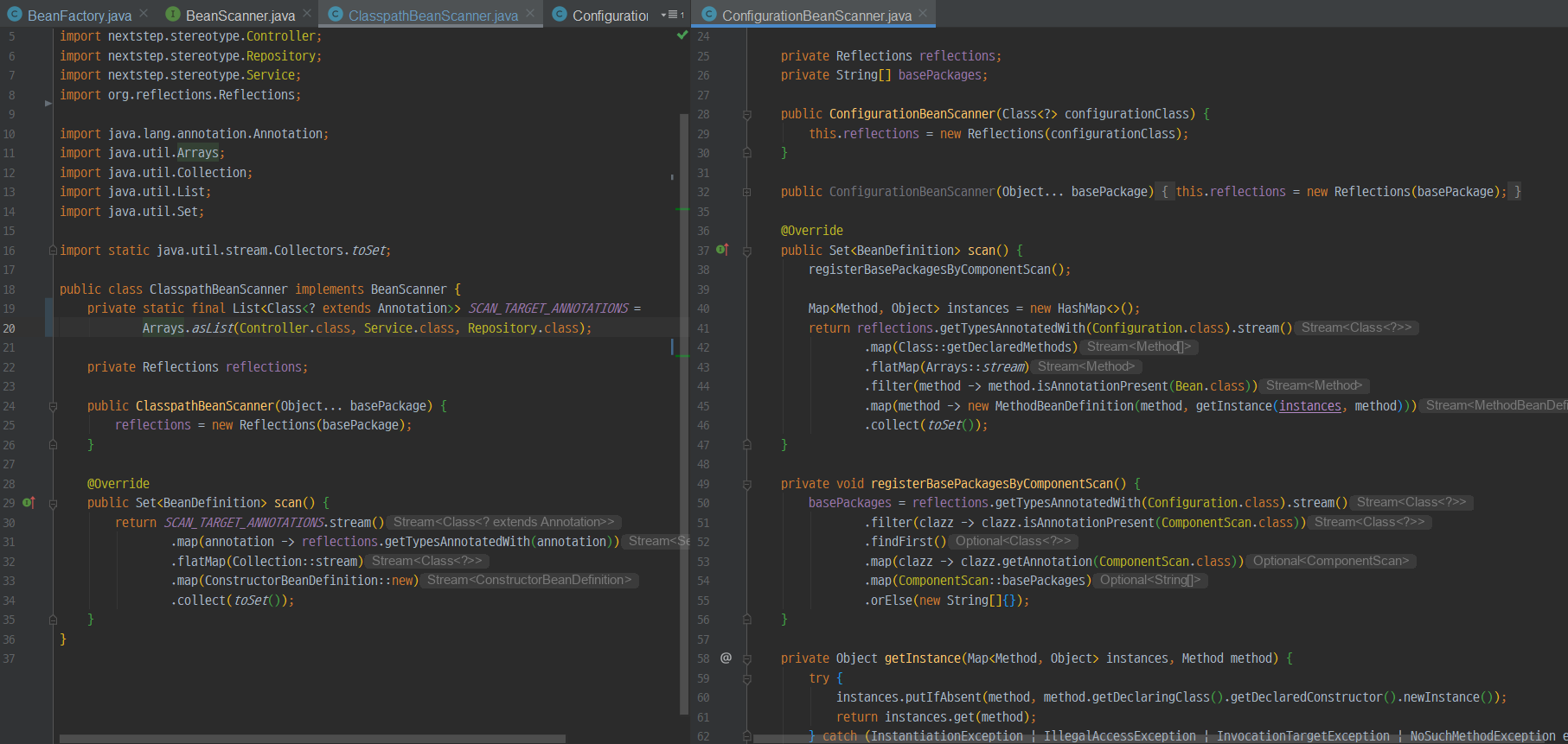 - 결국엔 생성자/메소드 두 방식으로 다르게 인스턴스화된다는 사실 : 기본적으로 ClasspathBeanScanner-ConstructorBeanDefinition, ConfigurationBeanScanner-MethodBeanDefinition으로 매핑되던 구조