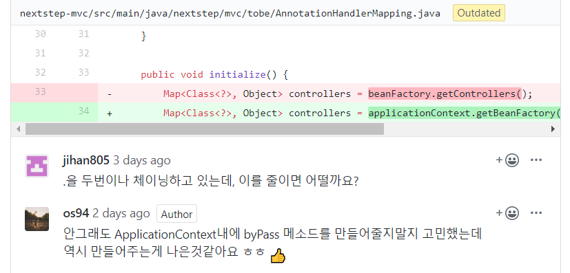 - 지금은 사용하는 쪽이 간단해서 getBeanFactory()만 만들어두었는데, 나중을 생각하면 주요 메서드들을 bypass 메서드로 만들어뒀어도 좋았을거같단 생각. -> 역시, 피드백으로 와서 ApplicationContext가 담당할수있도록 bypass메서드 추가!