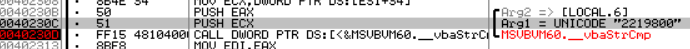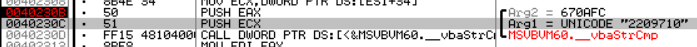 vbaStrCmp()는 실행되며 인자로 eax, ecx를 넣는다.