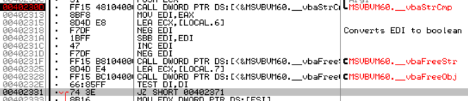 그리고 이 DI는 vbaStrCmp()의 결과가 eax에 저장된후 다시 edi로 복사된다.