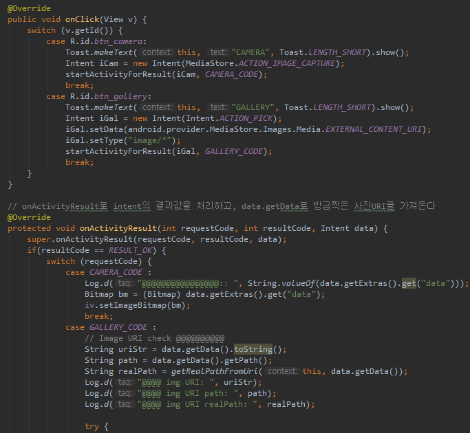 onActivityResult()로 intent 결과값을 받아오는 부분에서