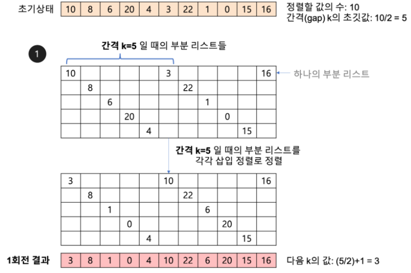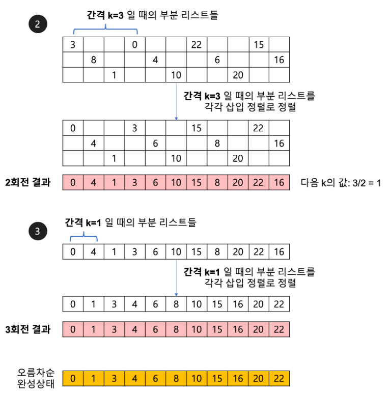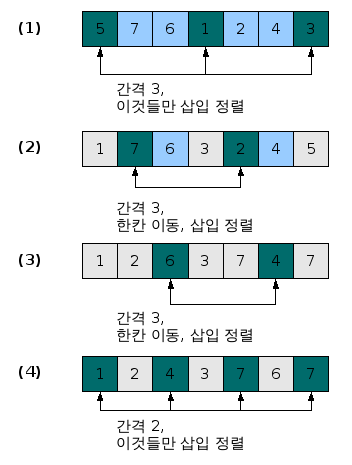 일정간격으로 부분집합을 구성하고, 각 부분집합에 대해 삽입정렬을 수행.
