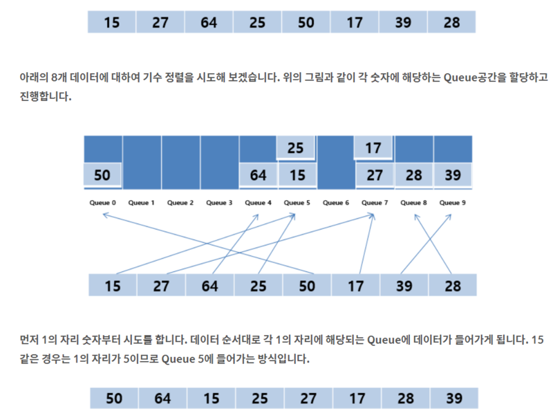 원소의 키를 표현하는 값의 기수(radix, 10진수의 경우 0~9까지 10개)개의 Bucket(큐, 배열 ..)을 준비한 뒤,