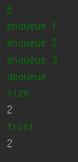 첫 줄에 명령어의 개수 N이 주어집니다. (1 ≤ N ≤ 1,000,000) 두번째 줄부터 N개의 줄에 걸쳐 아래의 명령어가 입력됩니다. enqueue x : x를 큐에 삽입합니다. dequeue : 가장 먼저 들어온 인자를 반환합니다. size : 큐의 크기를 출력합니다. front: 큐의 맨 앞 인자 값을 출력합니다. | 각 명령 순서에 따라 값을 출력합니다. |