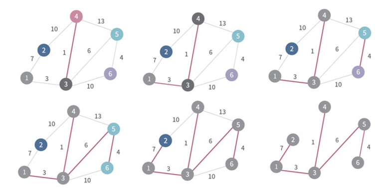 - 선택된 정점들과 연결된 모든 간선들 중에서 weight가 가장 작은 간선을 선택해 연결한다. (반복)
