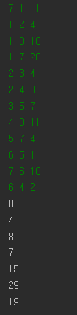 첫 줄에 정점의 개수 N과 간선의 개수 M, 그리고 시작 정점 S가 주어집니다. 다음 M줄에 간선의 관계 시작정점 u와 도착정점 v 그리고 간선 가중치 w가 주어집니다.  |