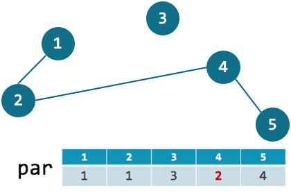두 정점이 같은 집합임을 나타내기 위해 간선으로 이어준 뒤, par[2]의 값을 1로 바꿔줍니다.