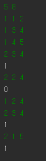 첫 줄에 정점의 개수 N과 명령어의 수 Q가 주어집니다. (1 ≤ V ≤ 100,000, 1 ≤ Q ≤ 100,000) 둘째 줄에 Q개의 줄에 걸쳐 다음과 같은 명령어가 들어옵니다. 1 x y: x가 속한 그룹과 y가 속한 그룹을 합칩니다. 2 x y: x와 y가 같은 그룹에 속해있다면 1, 아니라면 0을 출력합니다. | 명령어의 결과를 출력합니다. |