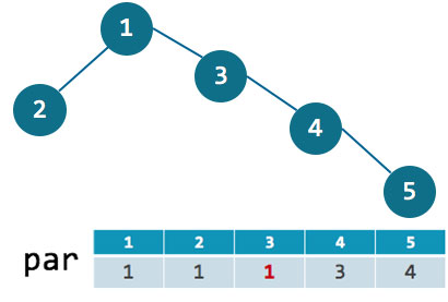 마찬가지로 3번과 4번, 4번과 5번 정점이 이어지고, par[4]의 값을 3으로, par[5]의 값을 4로 바꿔줍니다.