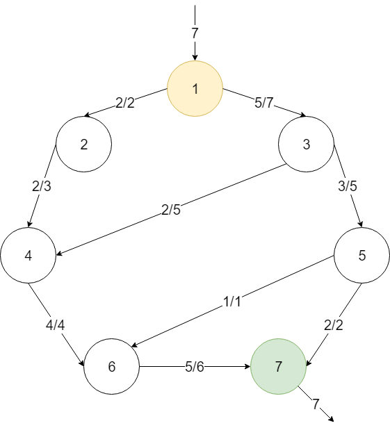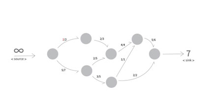 (source에서 위로2만큼&아래로5만큼 보내서 총7만큼 sink로 보내는것이, 물을 넘쳐서 버리거나 부족해서 빈공간이 없는 최적의 효율적인 양인것)