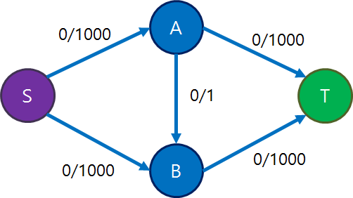 A같은 경우가 발생하는것은 물이 단방향으로 흘러 한번 흐른 유량의 방향을 바꿀수없기 때문이다. 따라서 잔여간선을 이용해, 한번 흐른 물을 다시 되돌려보내 다른 방향으로 보낼수있도록 한다. 이렇게 우회경로를 찾는다.
